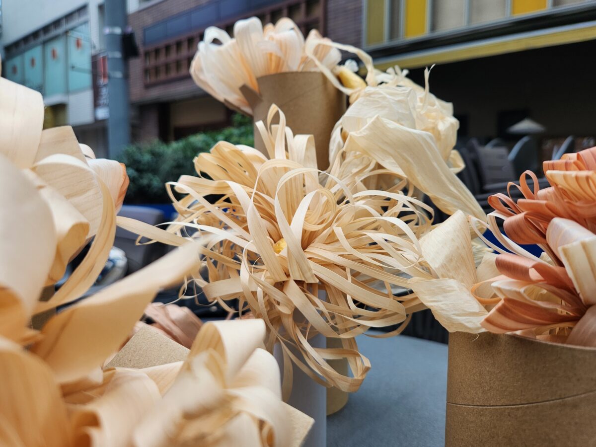 小さなお子様連れのご家族を中心に木工教室で車を造ったりカンナくずでフラワーアートをしたりと楽しい時間を過ごさせて頂きました。