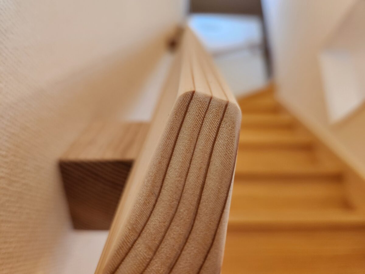 そこで今回は、常設展示場に使われているスギの「階段手すり」を、さらにもっと「気持ちよく心地がいい」と感じられるように、私なりに久しぶりの手作業(^^ゞで、ひと手間加えてみることにしました。