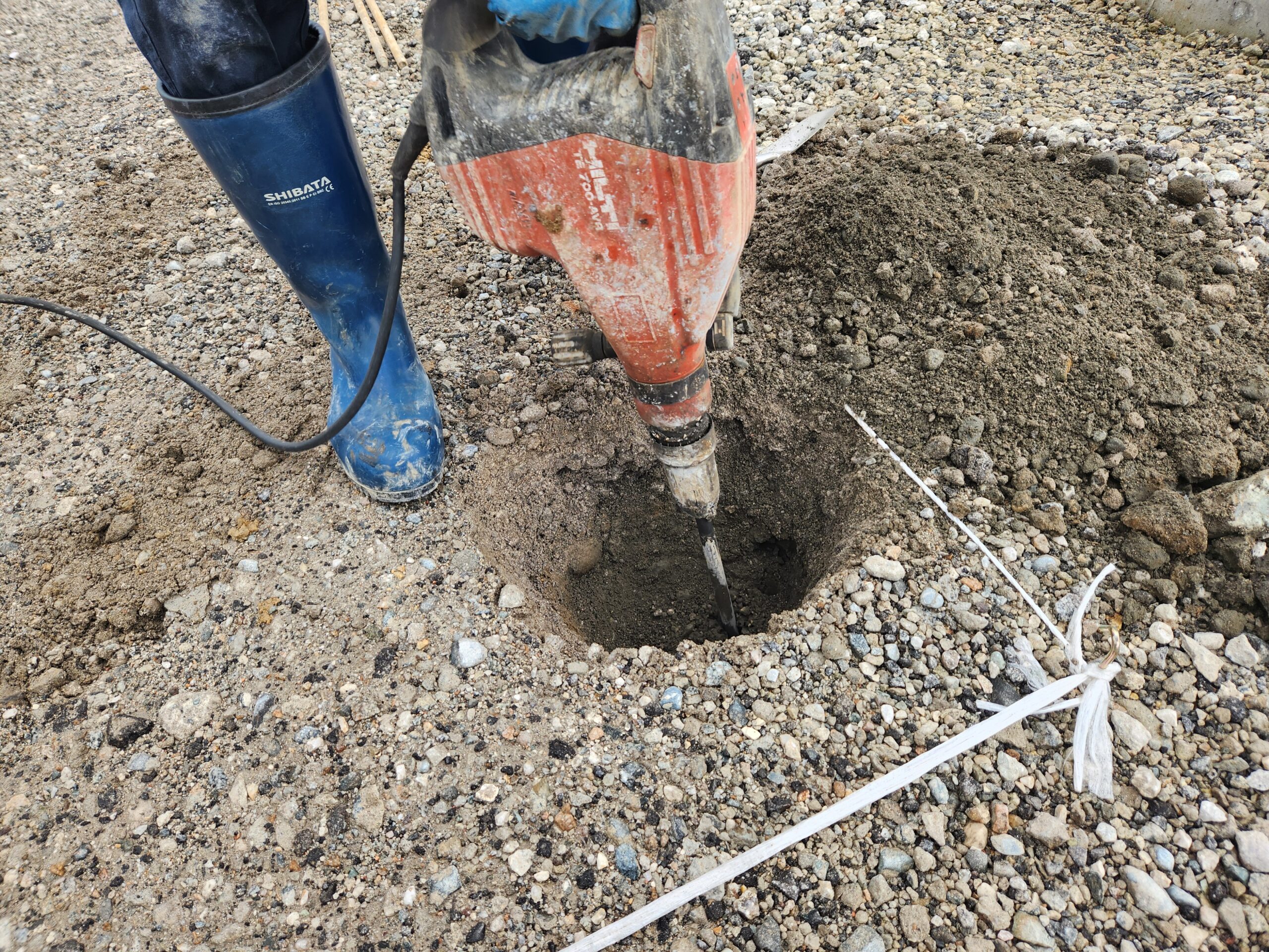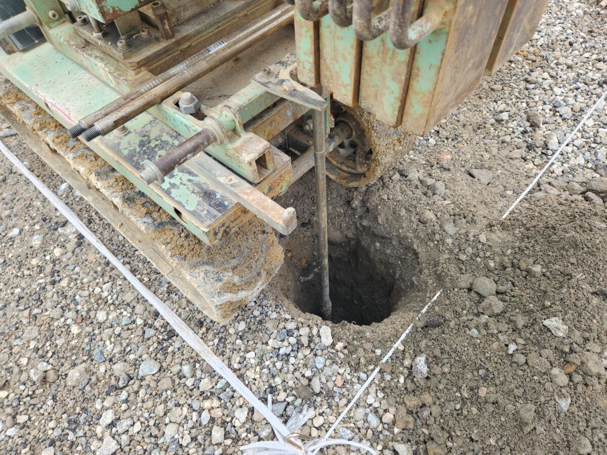 では早速。現在では住宅を建築するにあたり必ず地盤調査を行うことが必須となっています。住宅の重みに耐えられるかどうか、敷地に対して住宅の配置が決まったら家の四隅、中心部分の真下に強い地盤があるかどうかを調べるものです。
