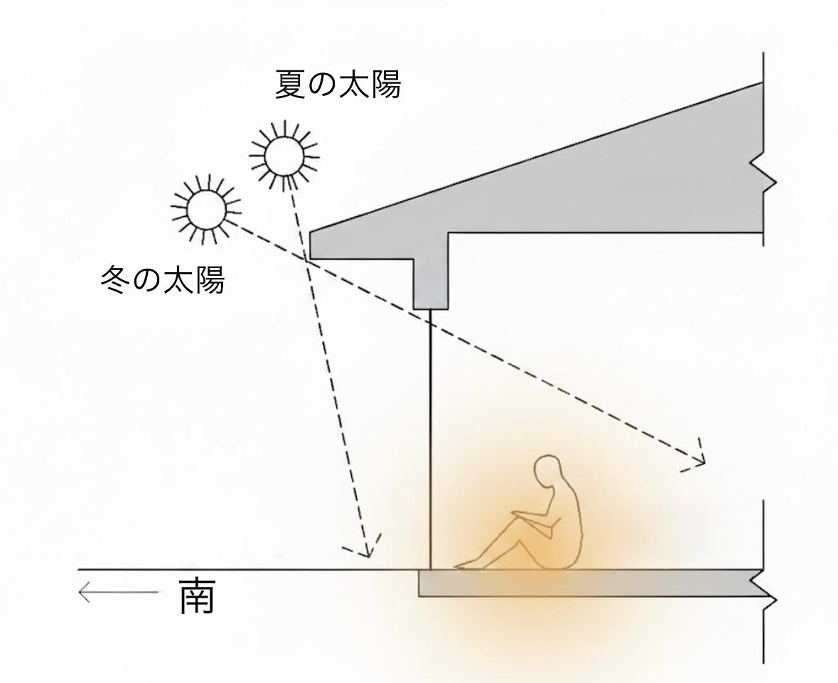太陽の軌道は夏と冬で大きく違うことは皆さんご承知の人も多いはず。夏は太陽の高度が高いので屋根の真上のような位置から日差しを下ろすため庇を多く出すことで室内に日差しを入れない「日射遮蔽」が可能となります。逆に冬は太陽の高度が低いので庇があっても南側で大きな窓を設ければ、陽の入る「日射取得」が得られます。