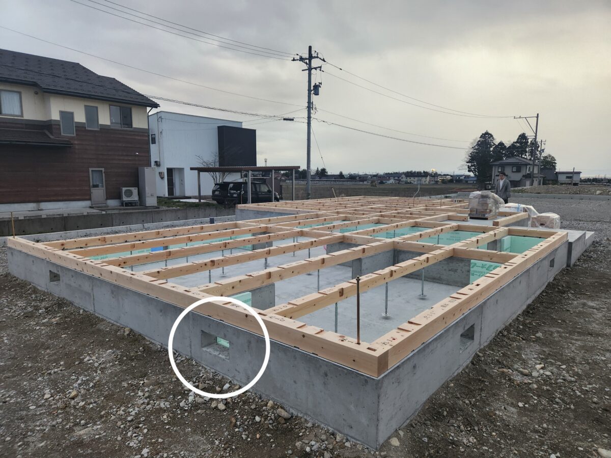 基礎の外周には一定の間隔で「風窓」を設置しています。ここが通気断熱WB工法の要、「通気」の取り入れ口。バリアヘルスなる通気装置を取り付けます。ここでは四季を通じて形状記憶合金のバネが温度を感知し開閉する仕組みを持っています。