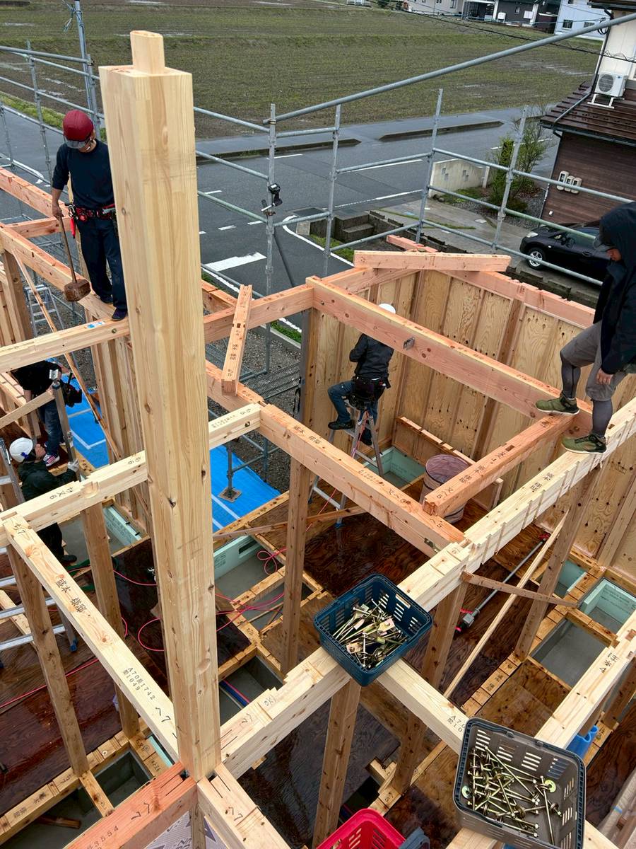 富山のミスターWB、茶木です。いよいよ4月10日(金)、滑川市でのお住まいが上棟しました!天気予報ではちょうどこの日だけ雨予報、前後は晴天なのに・・でも当日は小雨程度で上棟には差し支えない天気となり作業も順調に進み、無事に上棟式を迎えることができました。大工さん、現場監督さん達も本当にお疲れ様でした(^-^)