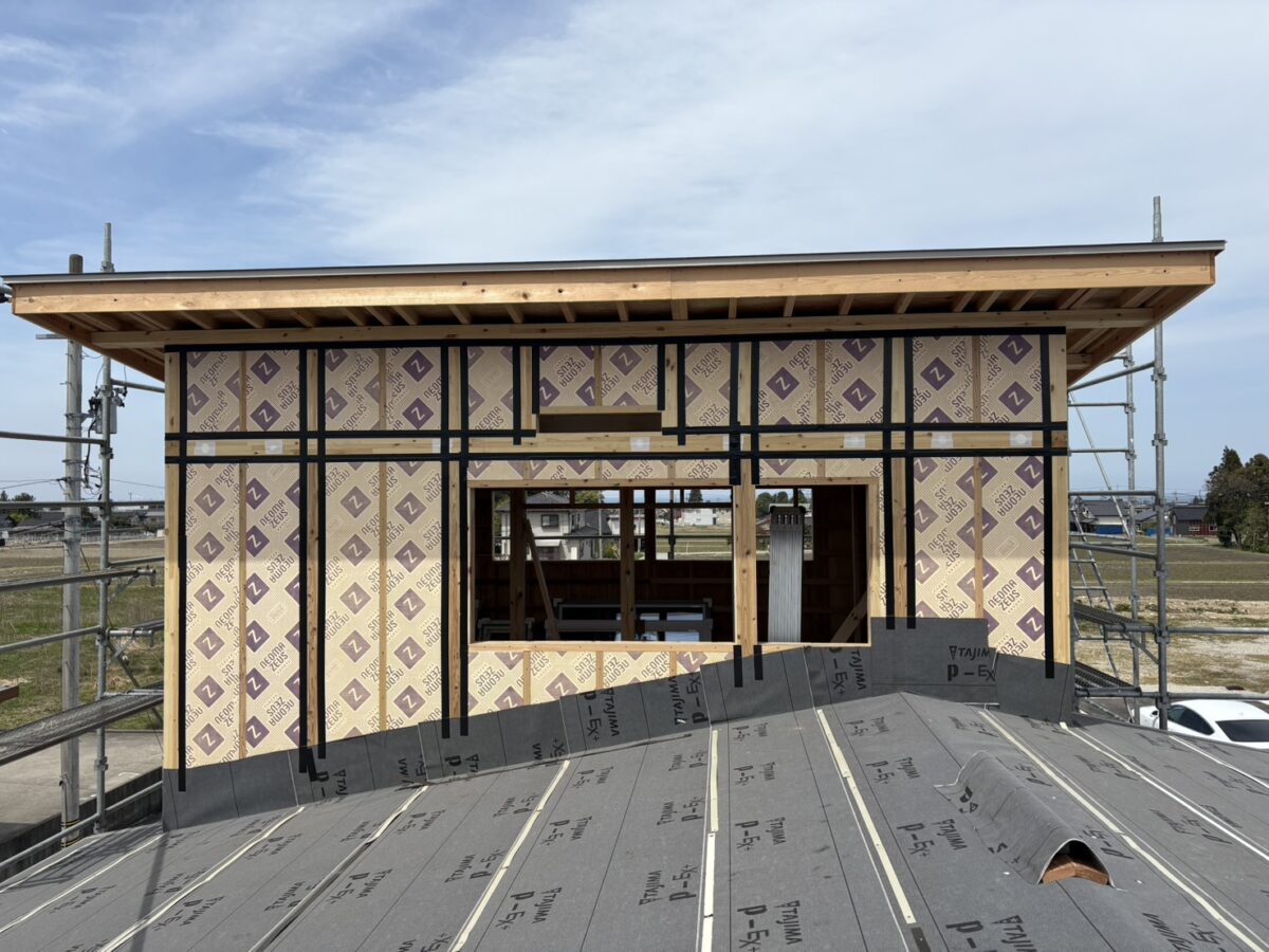 上棟を終えすぐに断熱材が家の外周をぐるりと包みます。今回のお住まいは「プレウオール」。