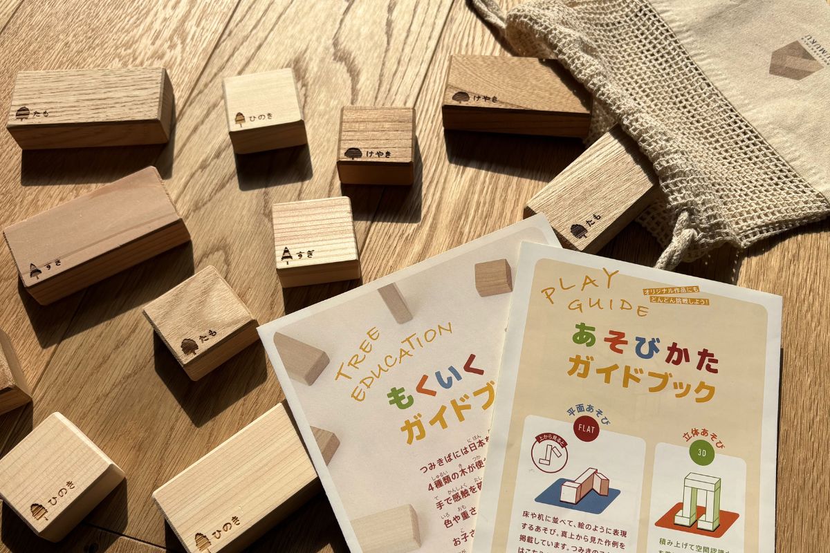 KUMUKUの家づくりで使っている「ひのき」や「すぎ」の天然無垢材の積み木セットです。